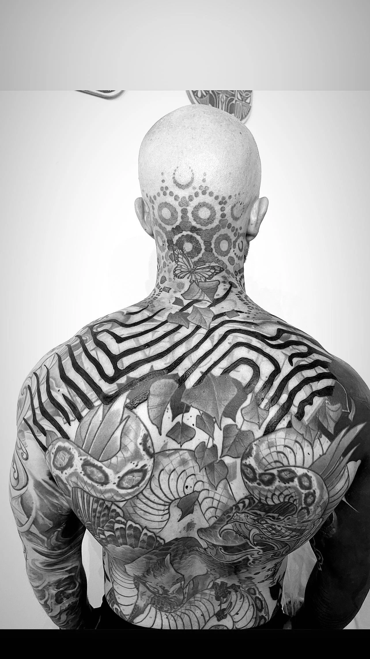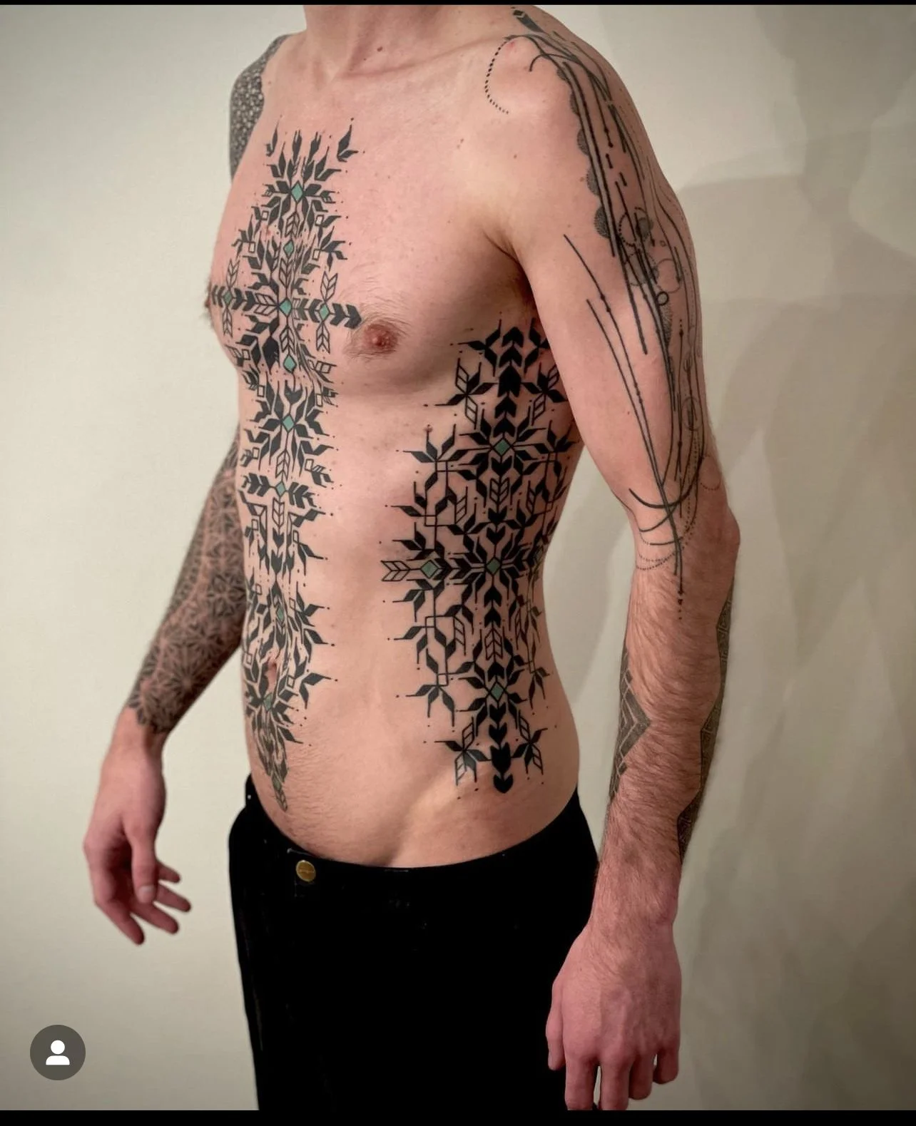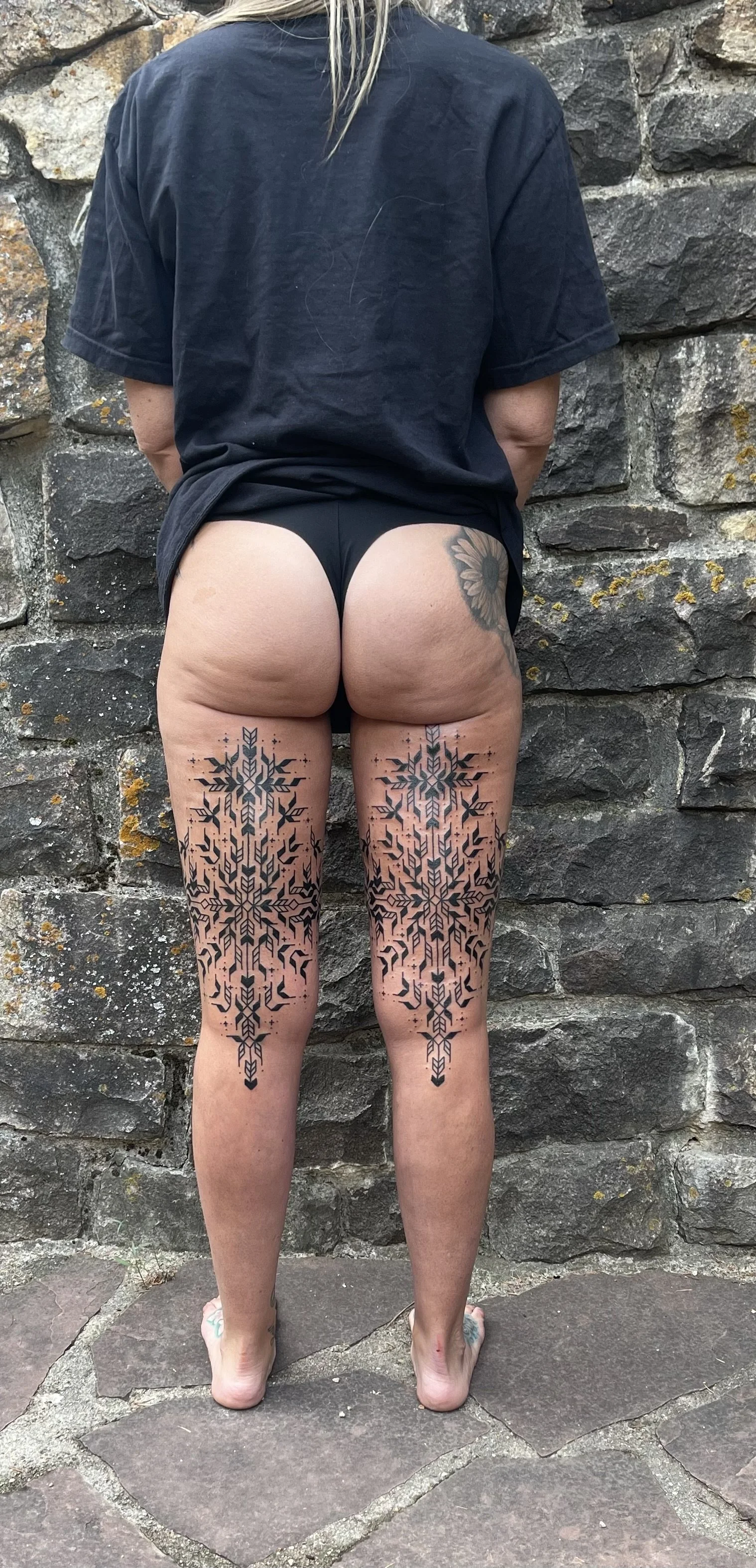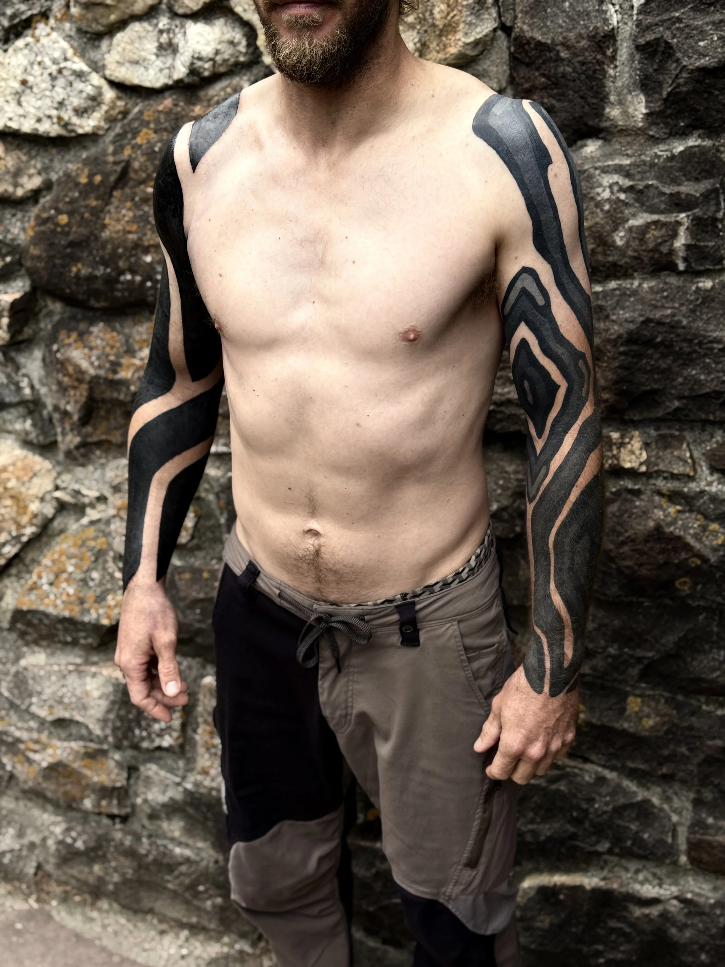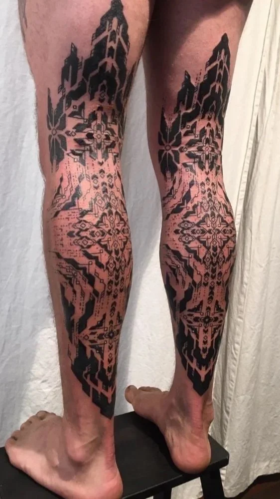 My offerings consist of utilizing Striking rich and bold black work ebbing with the flow of intricate geometric patterning- resembling the vibrational resonance of frequency harmonics -culminating together ceremonially to create a vibrant living talisman to walk forward with and echo throughout the annals of time .