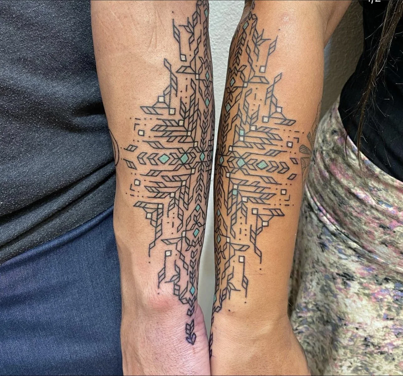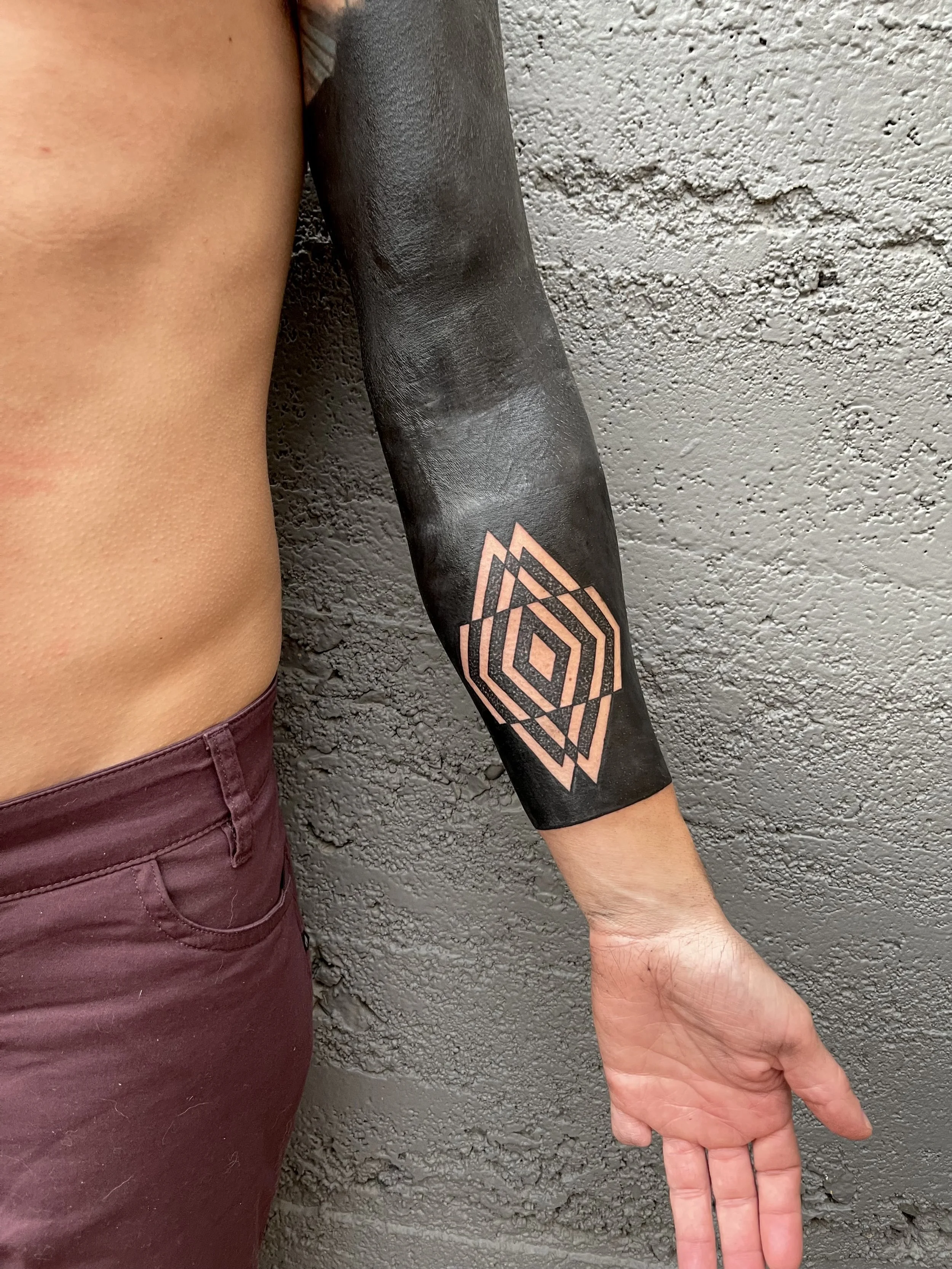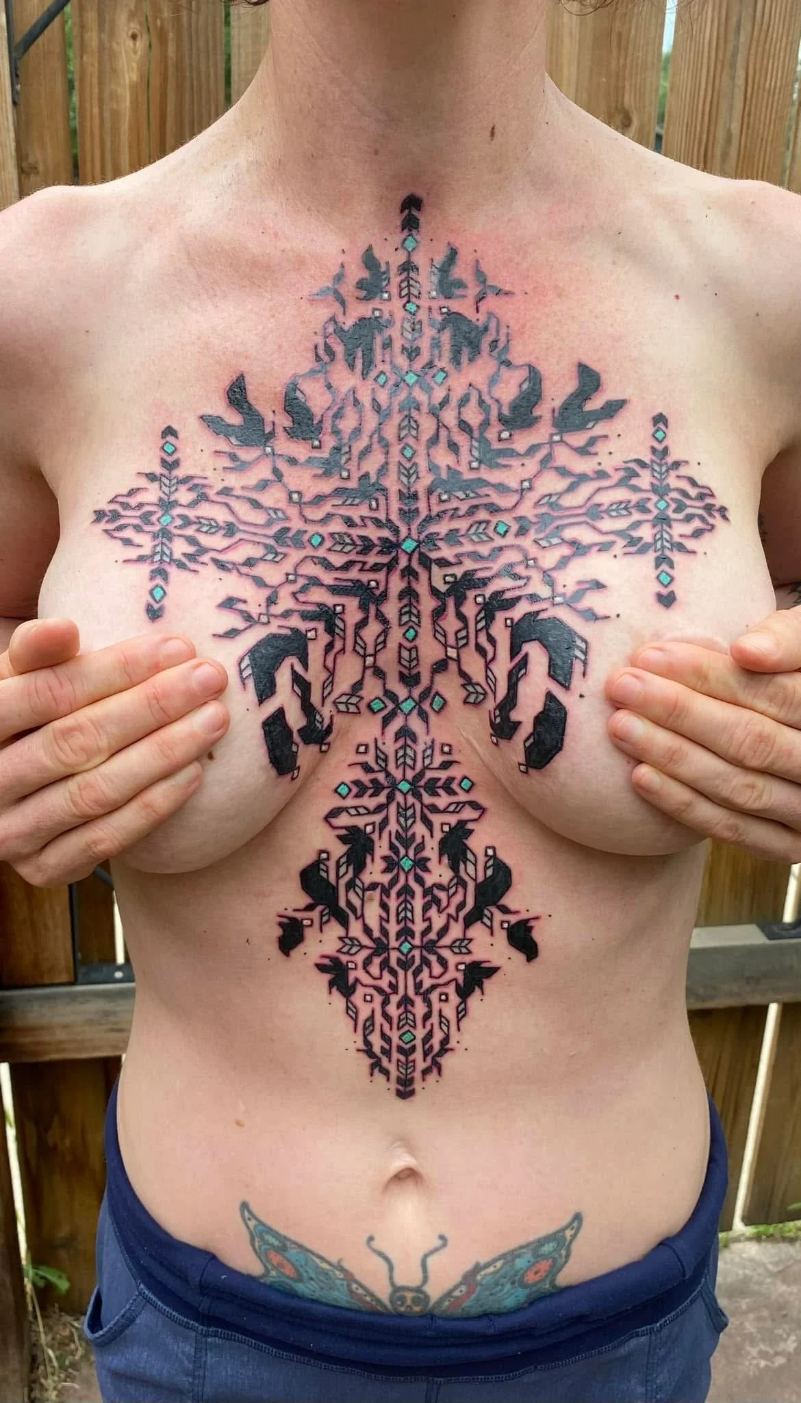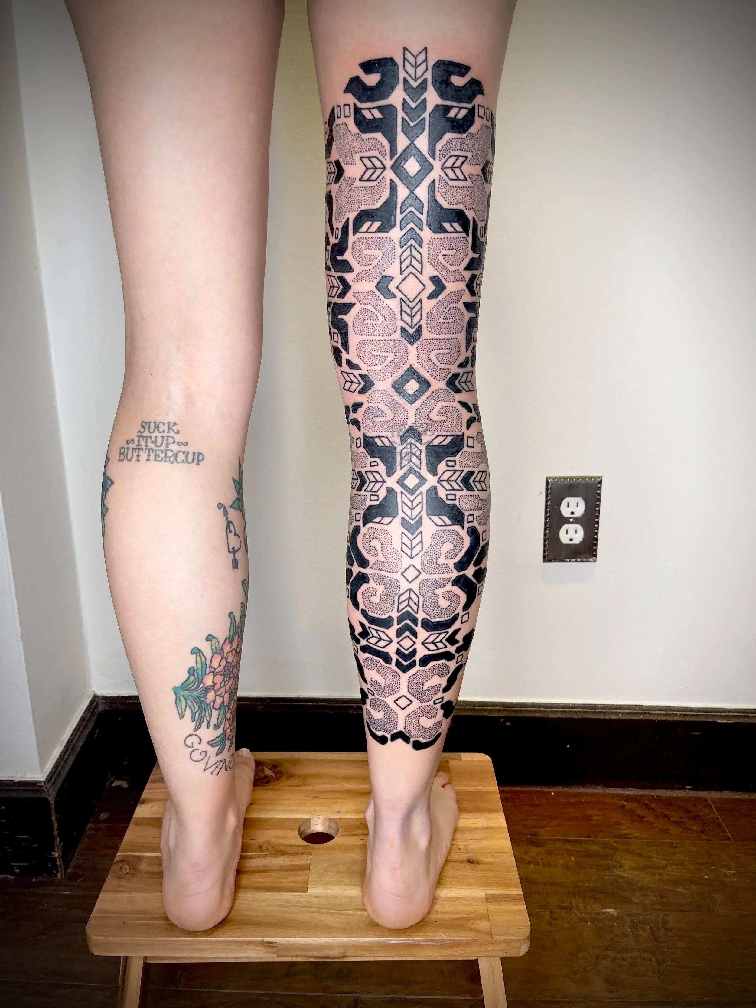Empowerment, through Endurance.Entering the crucible Sitting in the fireEmerging anew . Sternum 2.5 yrs healed Coverup collab w/KrisD Leg sleeve 1 of 2 Gabrielle -sleeves Aleya biceps&spine Mirrored Forearms Back Talisman Chest Talisman -Jen Partner matching forearms Lisana blk out sleeves woods Huachuma offering