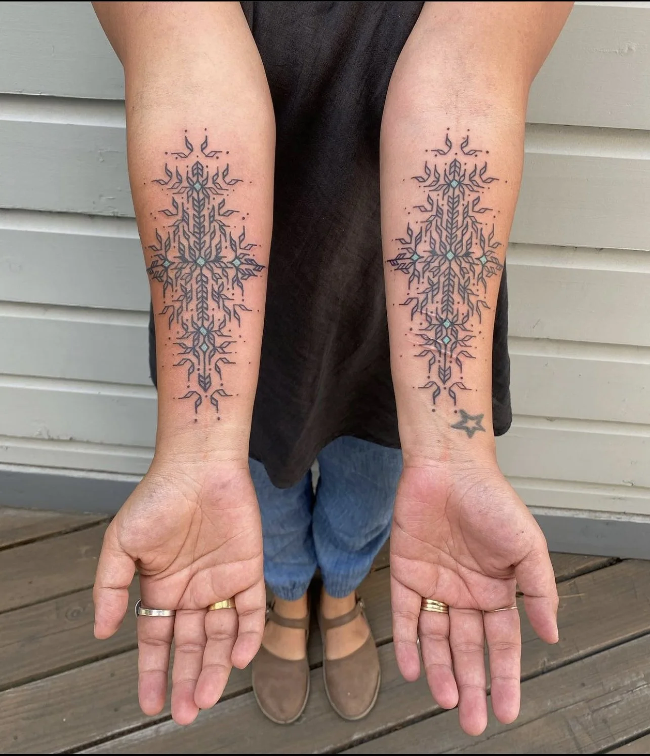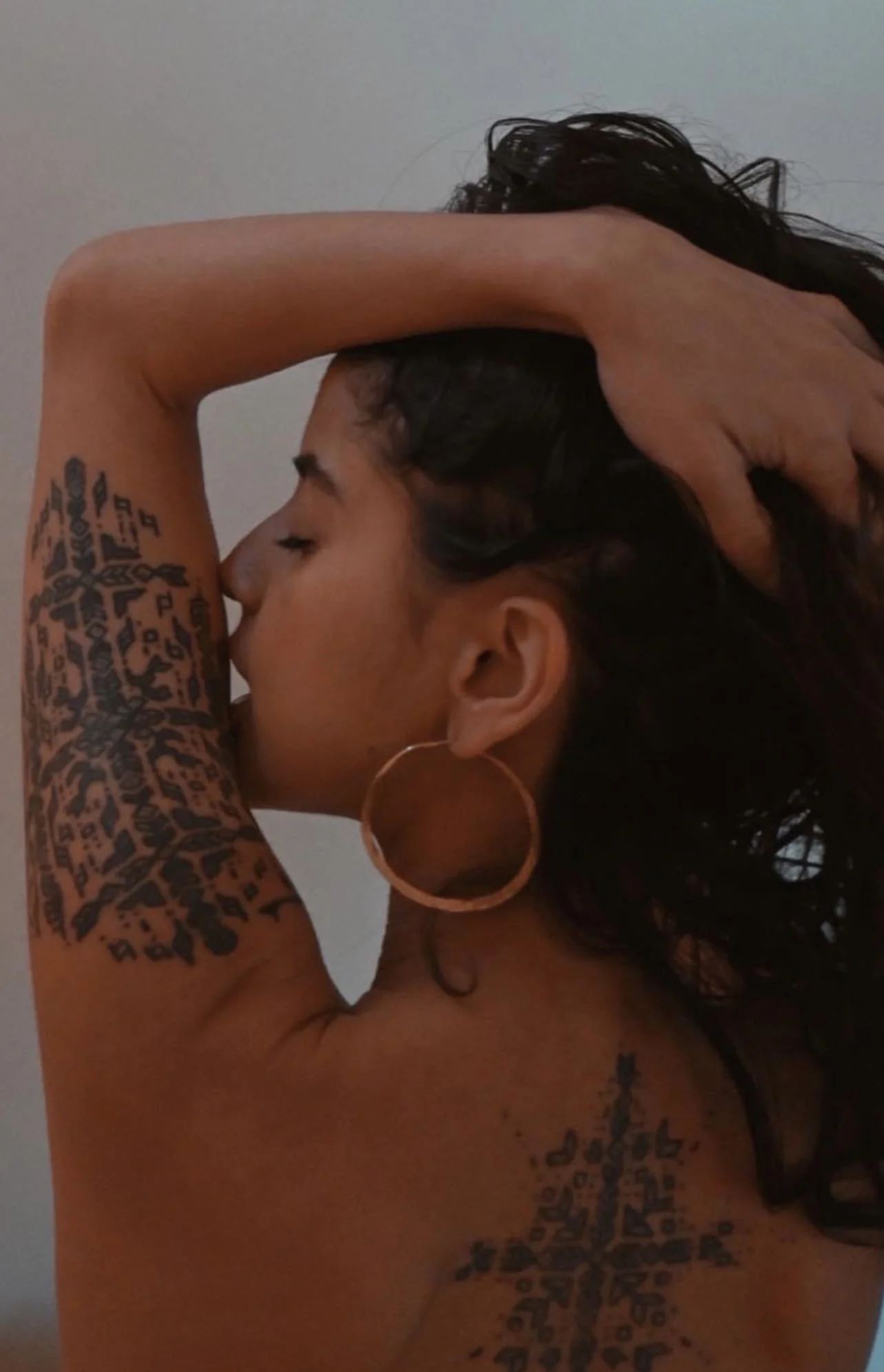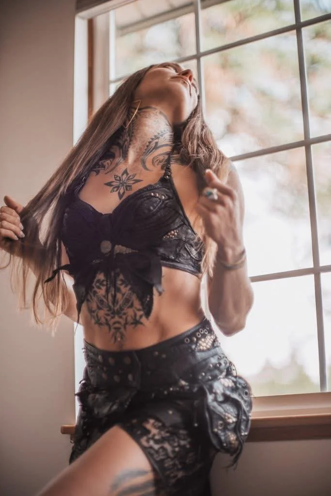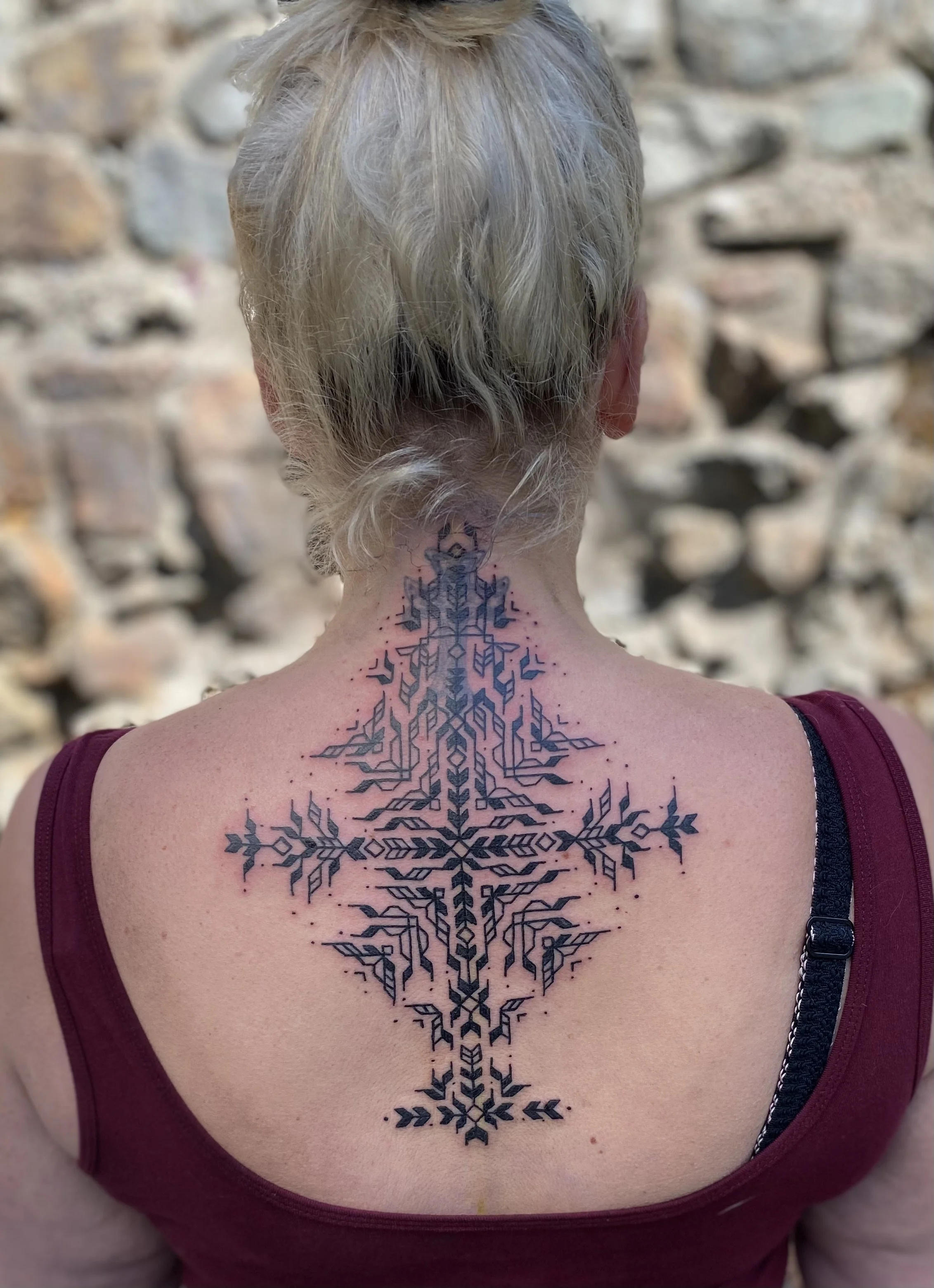 Empowerment, through Endurance.Entering the crucible Sitting in the fireEmerging anew . Sternum 2.5 yrs healed Coverup collab w/KrisD Leg sleeve 1 of 2 Gabrielle -sleeves Aleya biceps&spine Mirrored Forearms Back Talisman Chest Talisman -Jen Partner matching forearms Lisana blk out sleeves woods Huachuma offering